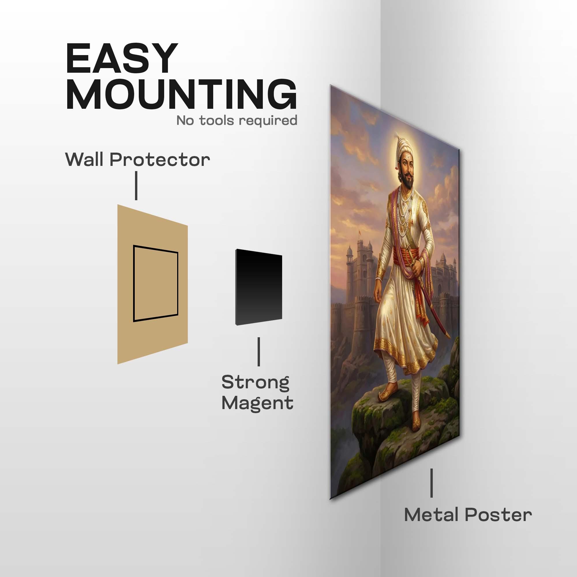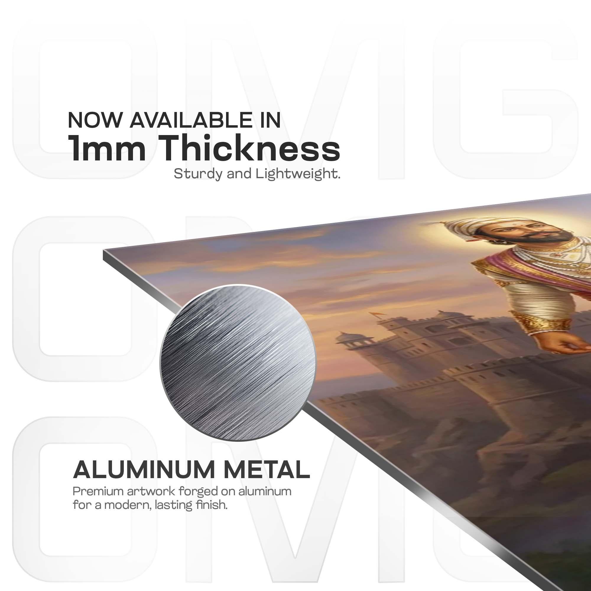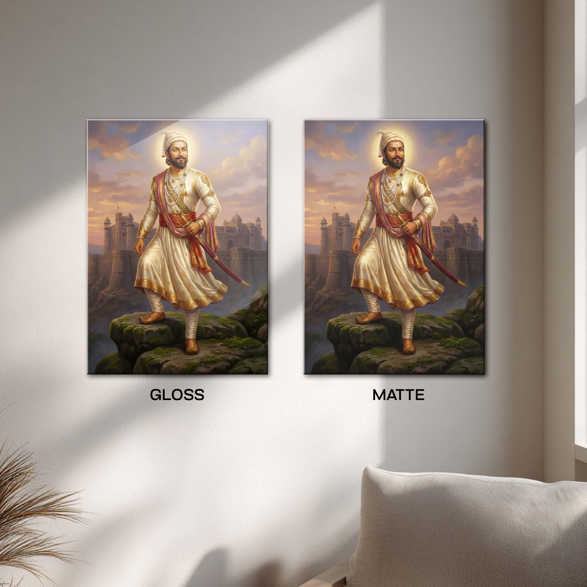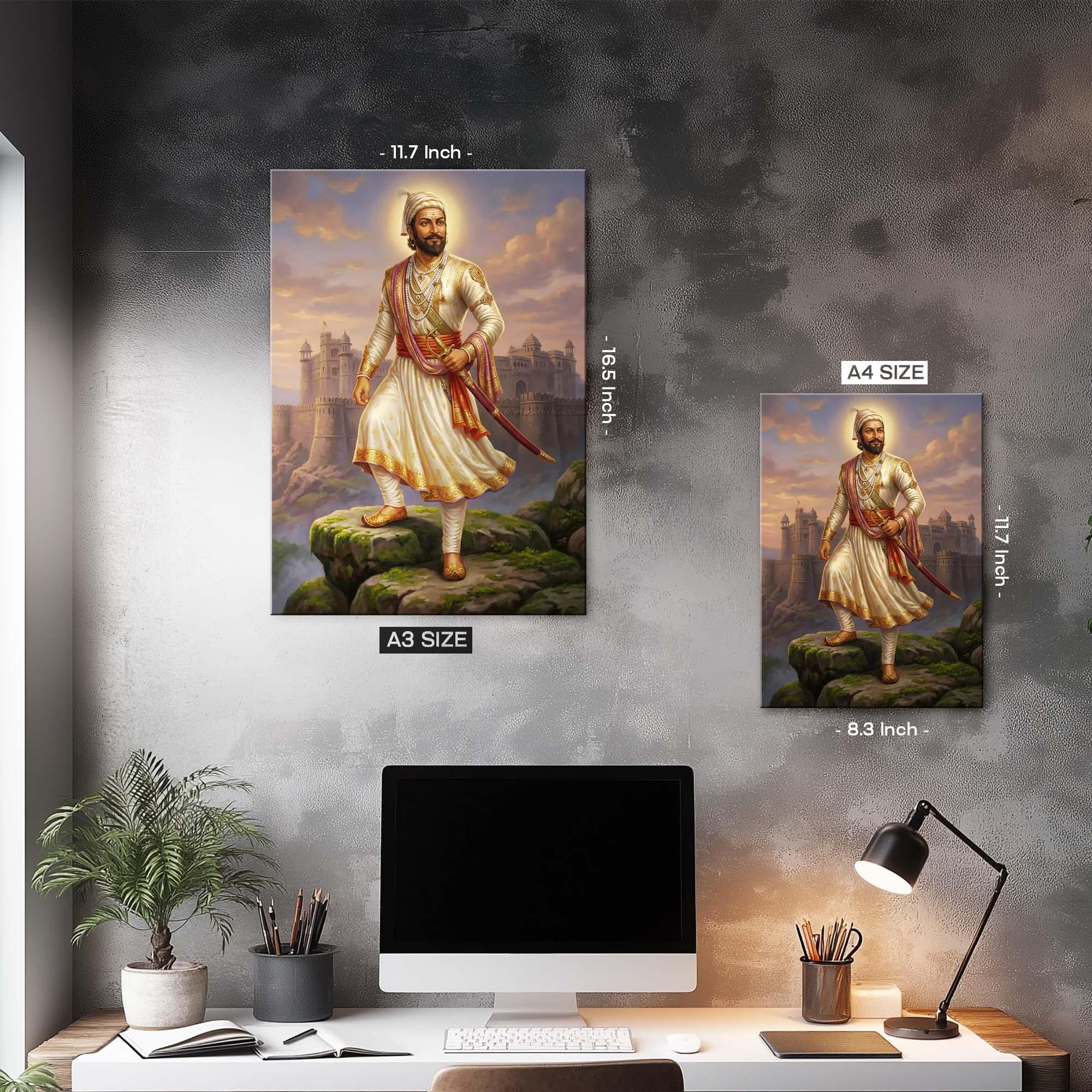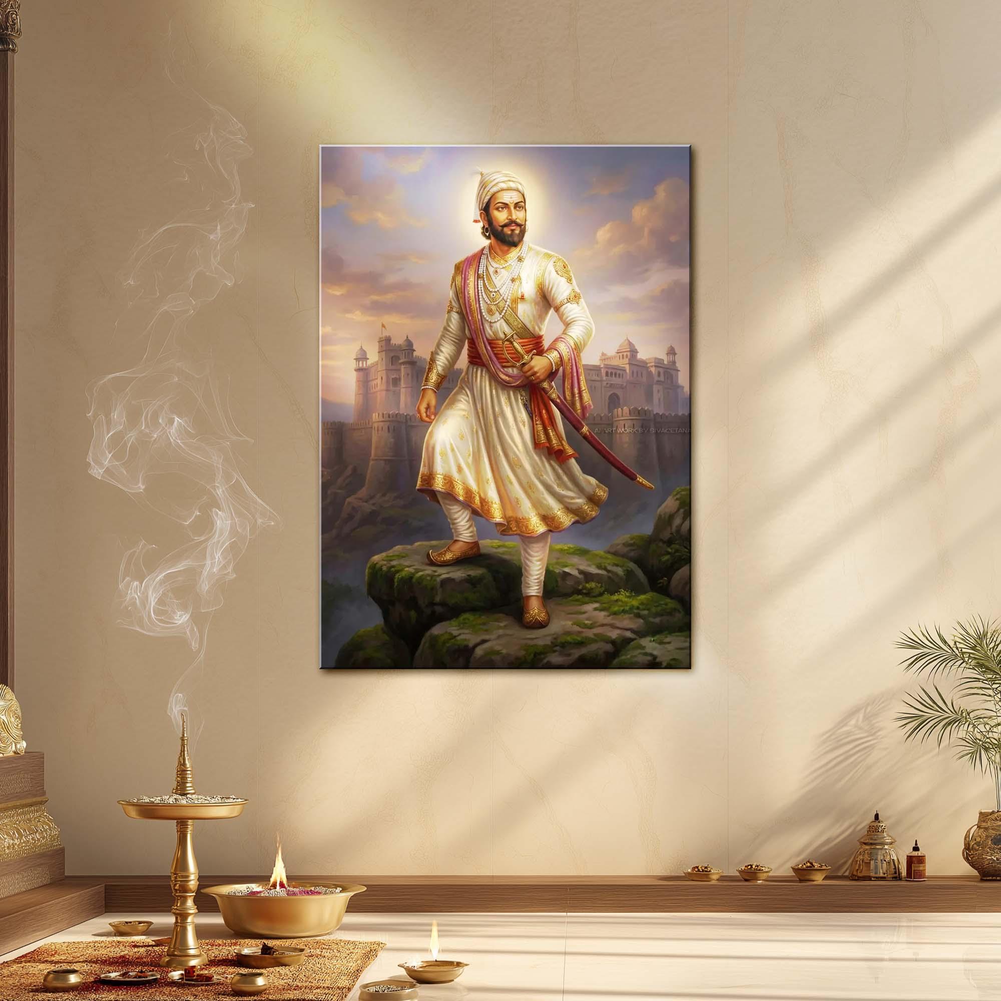Dressed in regal yet disciplined attire, adorned with subtle royal ornaments, and holding his sword with composed strength, Shivaji Maharaj represents the perfect balance of warrior might and ethical governance. The grand fort rising behind him evokes the glory of the Maratha Empire and the unbreakable foundations of freedom he laid for generations to come.