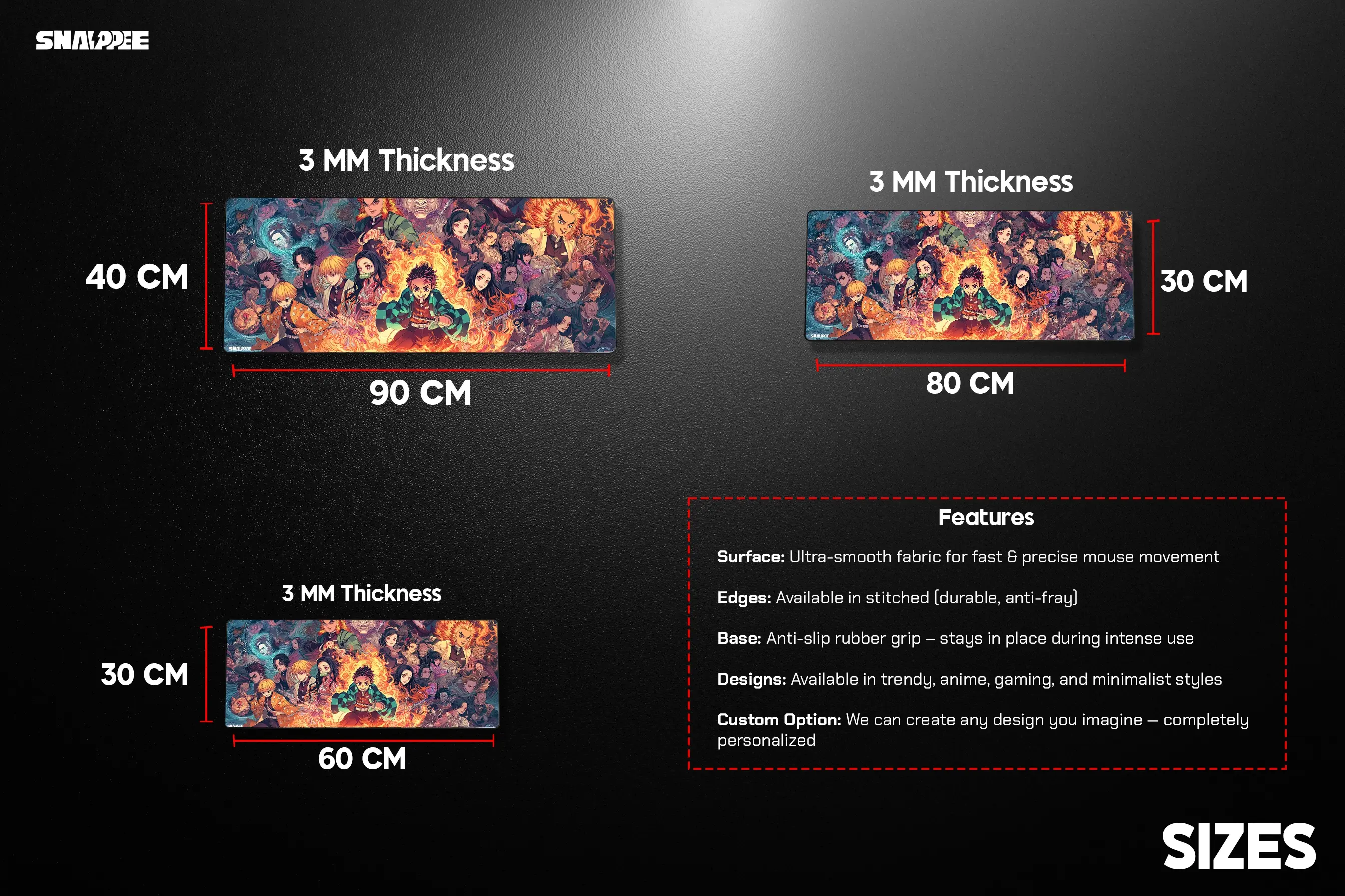 Unleash the power of the Hashira and step into the world of Demon Slayer with the OMG Customs Flame of Heroes Gaming Mousepad. Featuring breathtaking artwork of Tanjiro, Nezuko, Zenitsu, Inosuke, and the mighty Hashira, this mousepad combines anime passion with pro-level performance. Designed for gamers, creators, and anime lovers, it transforms your desk into a true battlefield of style and precision.