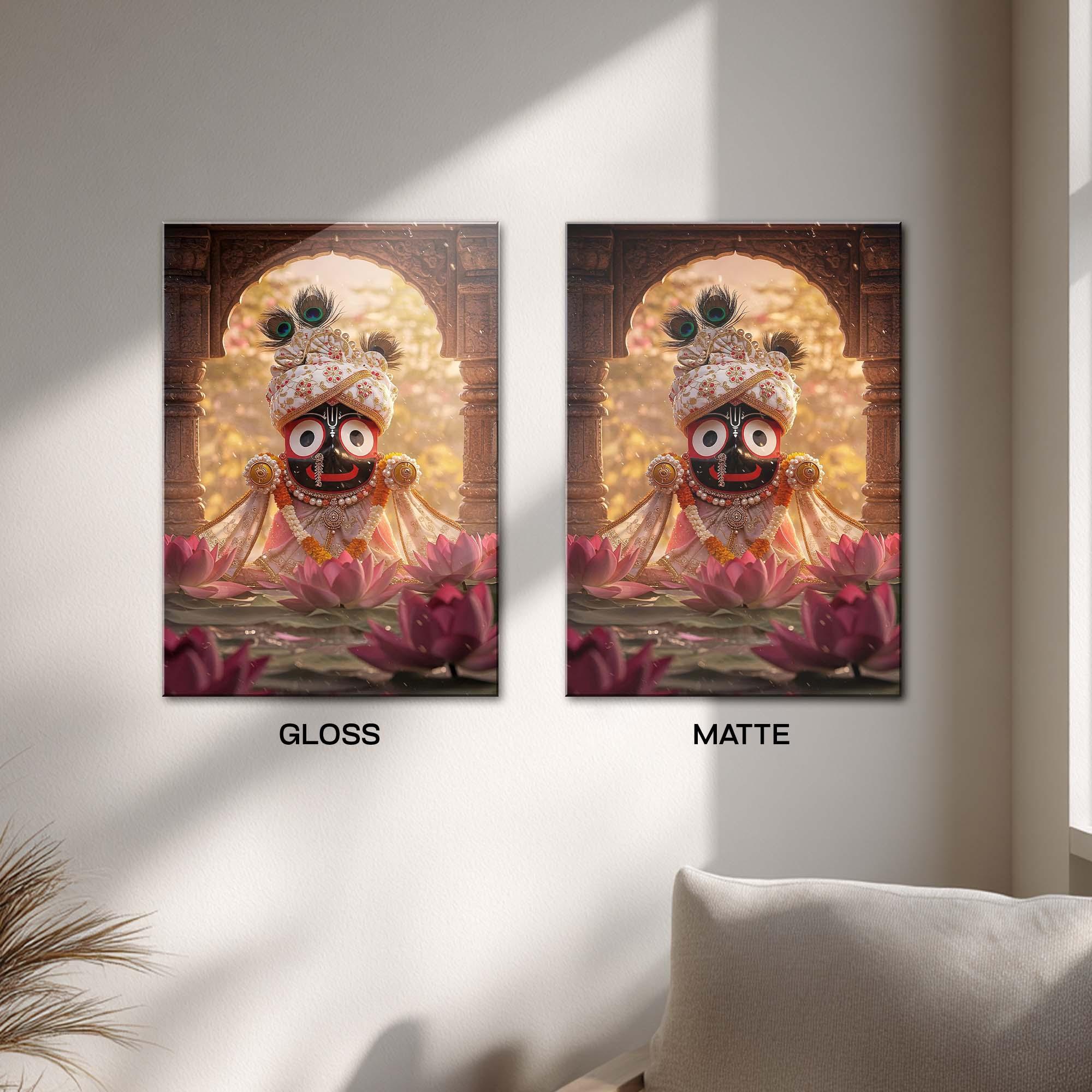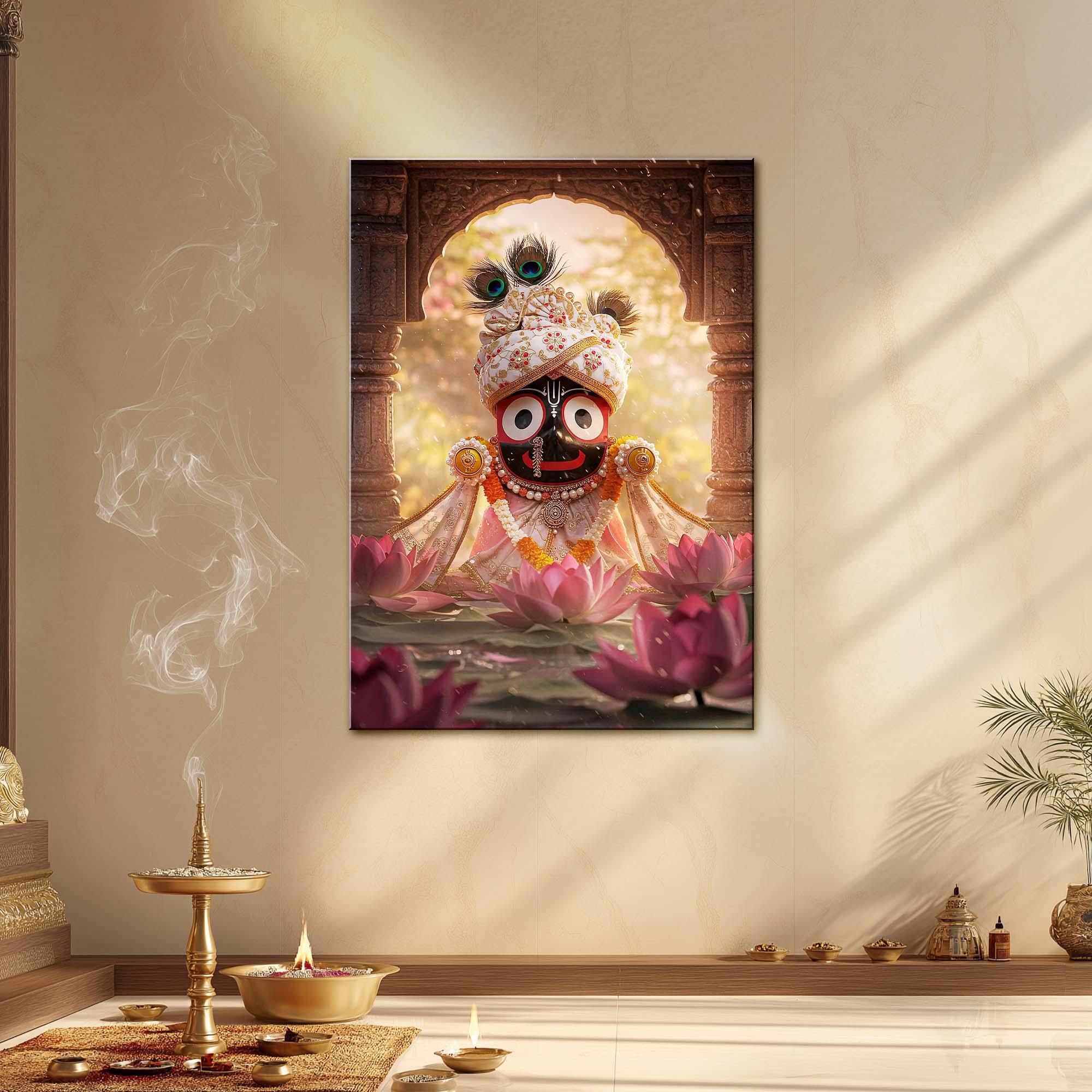 The expressive eyes of Lord Jagannath symbolize eternal watchfulness, protection, and unconditional love, while the lotus flowers represent purity, rebirth, and divine harmony. The composition beautifully balances devotion and elegance, making it a captivating centerpiece for any sacred or modern space.