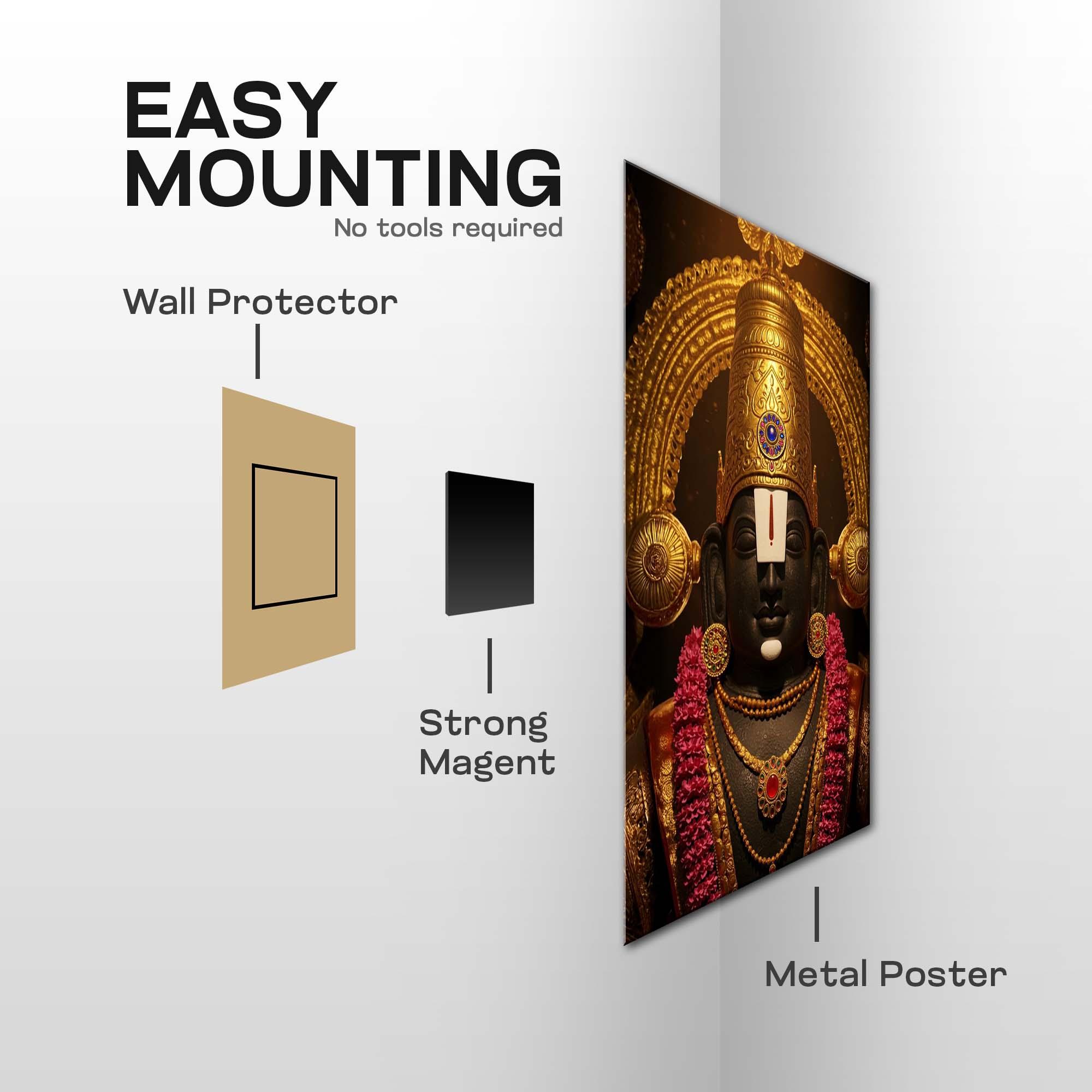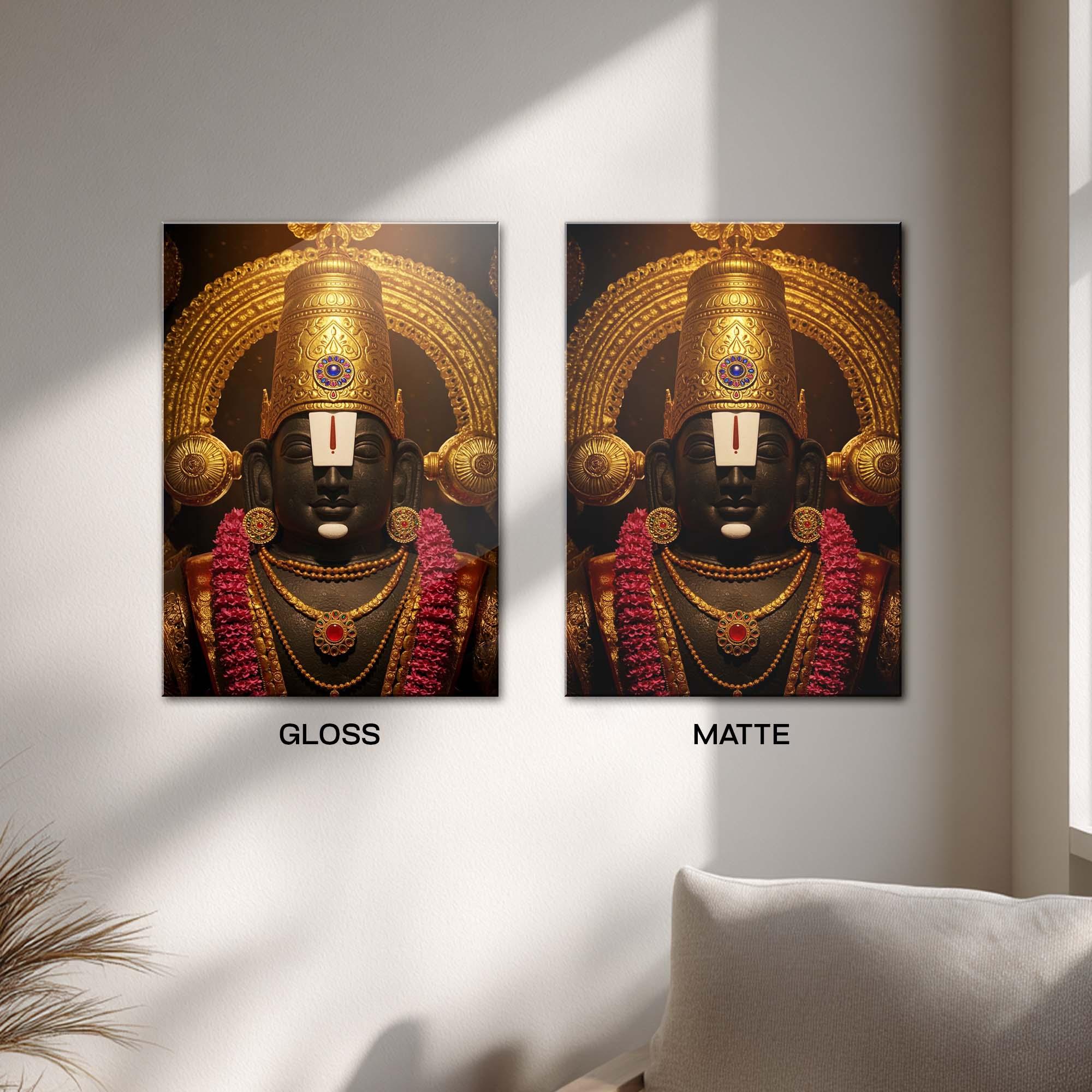 The deep, serene expression reflects unshakable calm, infinite compassion, and cosmic authority, while the golden halo signifies His role as the preserver of dharma in the Kali Yuga. Worshipped at the sacred hills of Tirumala, He is believed to remove obstacles, grant success, and bestow both material abundance and spiritual liberation.
