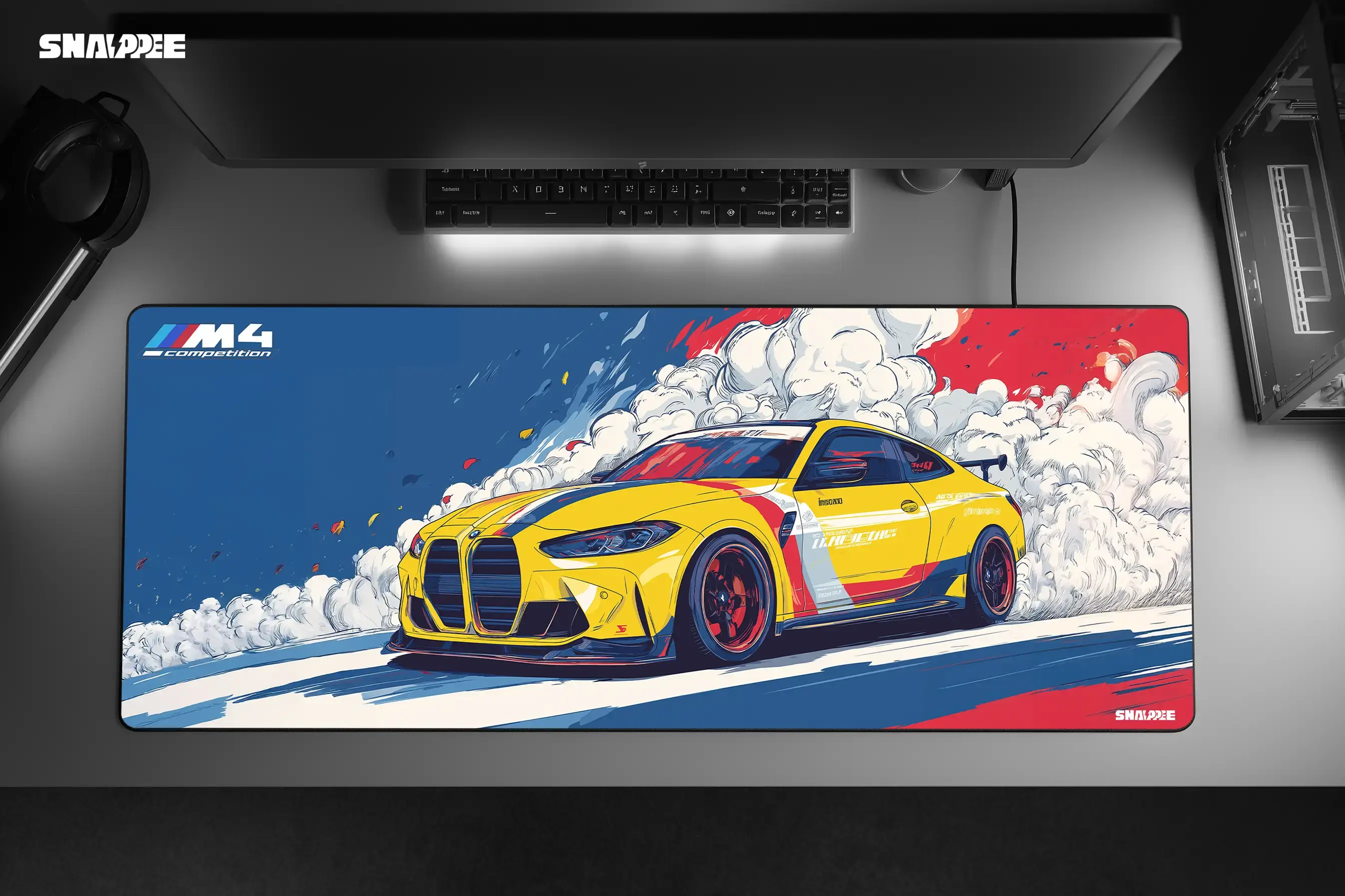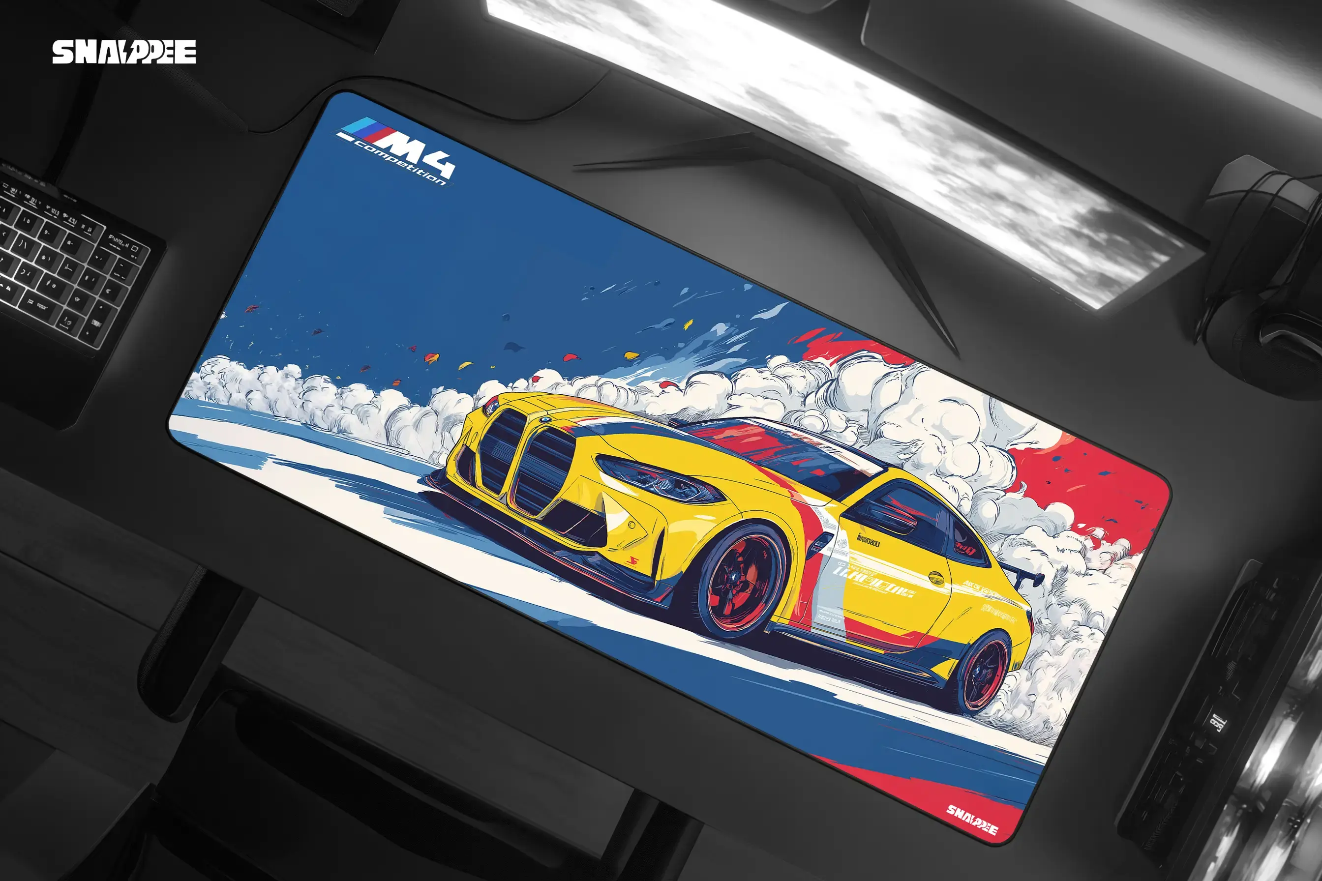 🎨 Exclusive M4 Drift Design – Striking artwork of the BMW M4 in full drift, with bold M-stripe flair — perfect for motorsport fans and esports warriors alike.