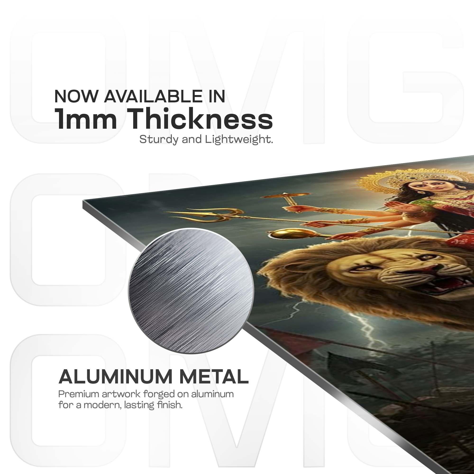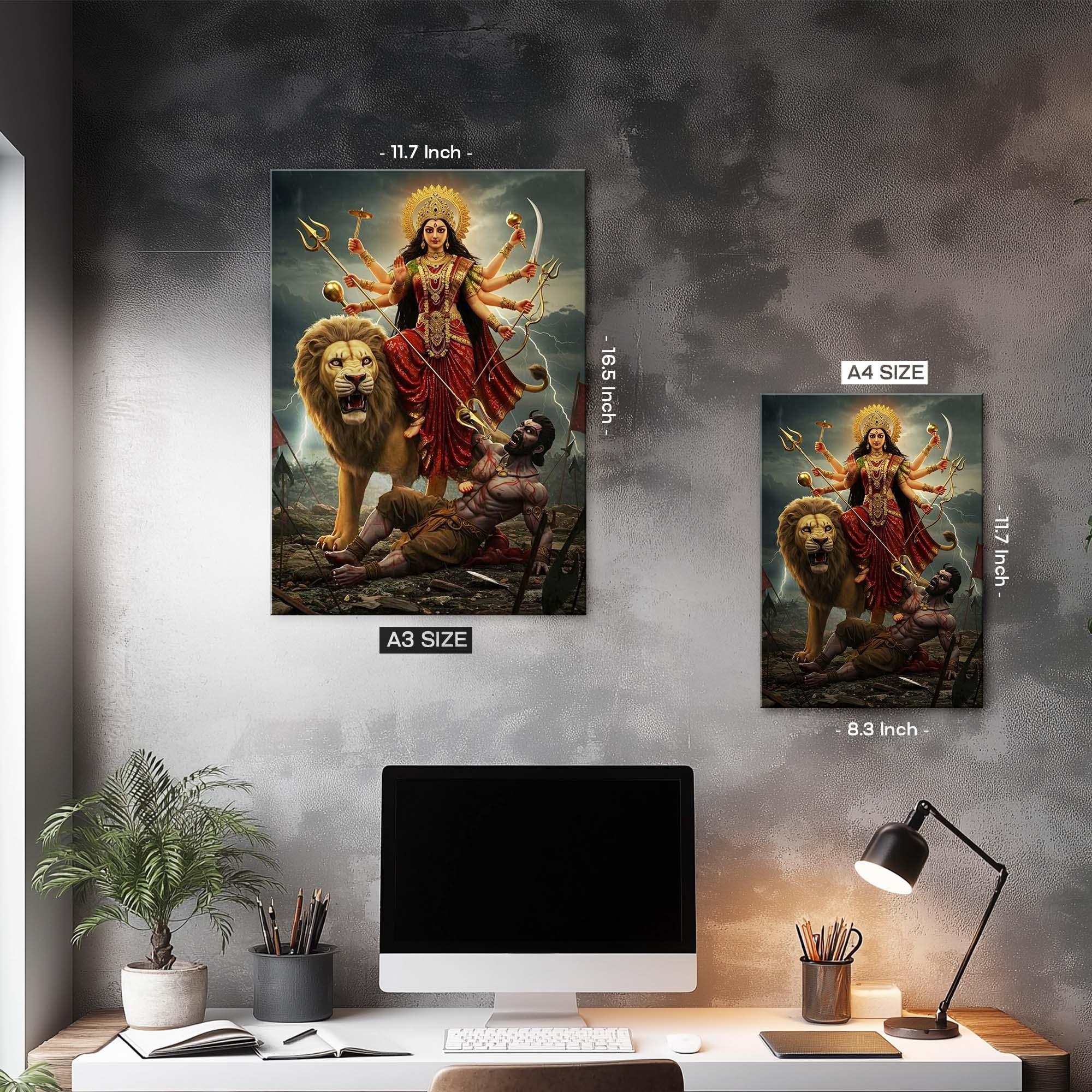 Adorned in a radiant crimson sari and crowned with a blazing golden halo, Maa Durga commands the cosmos with Her many arms—each wielding a sacred weapon bestowed by the gods themselves. The trishul, chakra, sword, bow, and conch blaze with divine energy, symbolizing Her absolute authority over creation, preservation, and destruction. By Her side roars the majestic lion, embodiment of courage, strength, and fearless righteousness.