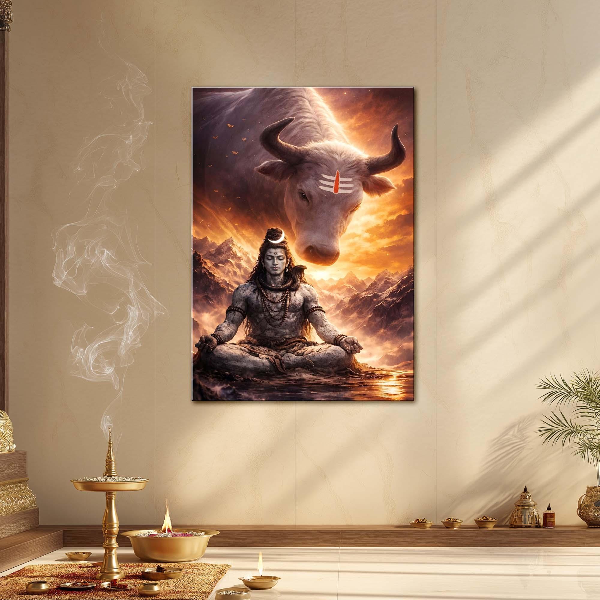 In this powerful artwork, Mahadev is portrayed in ash-toned serenity, seated in perfect yogic posture amid fiery Himalayan skies. His closed eyes reflect supreme inner balance, the state where creation and destruction dissolve into pure consciousness. Behind and above Him, Nandi emerges from the cosmic glow, marked with the sacred tripuṇḍra, symbolizing devotion, strength, patience, and unwavering dharma.