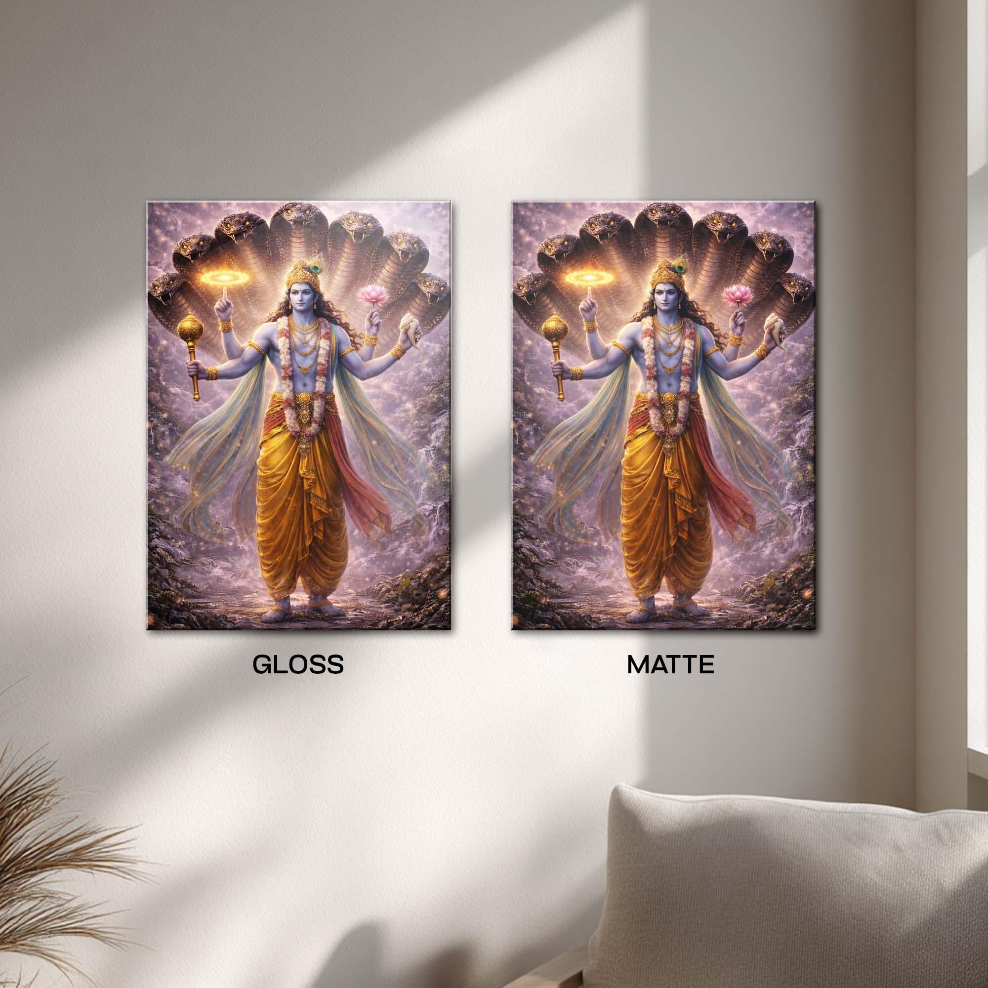 The serpent canopy arches gracefully above him, representing the endless cycles of existence and the eternal guardianship Vishnu offers to all beings. The cosmic aura and flowing divine energy surrounding the Lord create a powerful presence—one that fills the space with peace, protection, and spiritual authority.