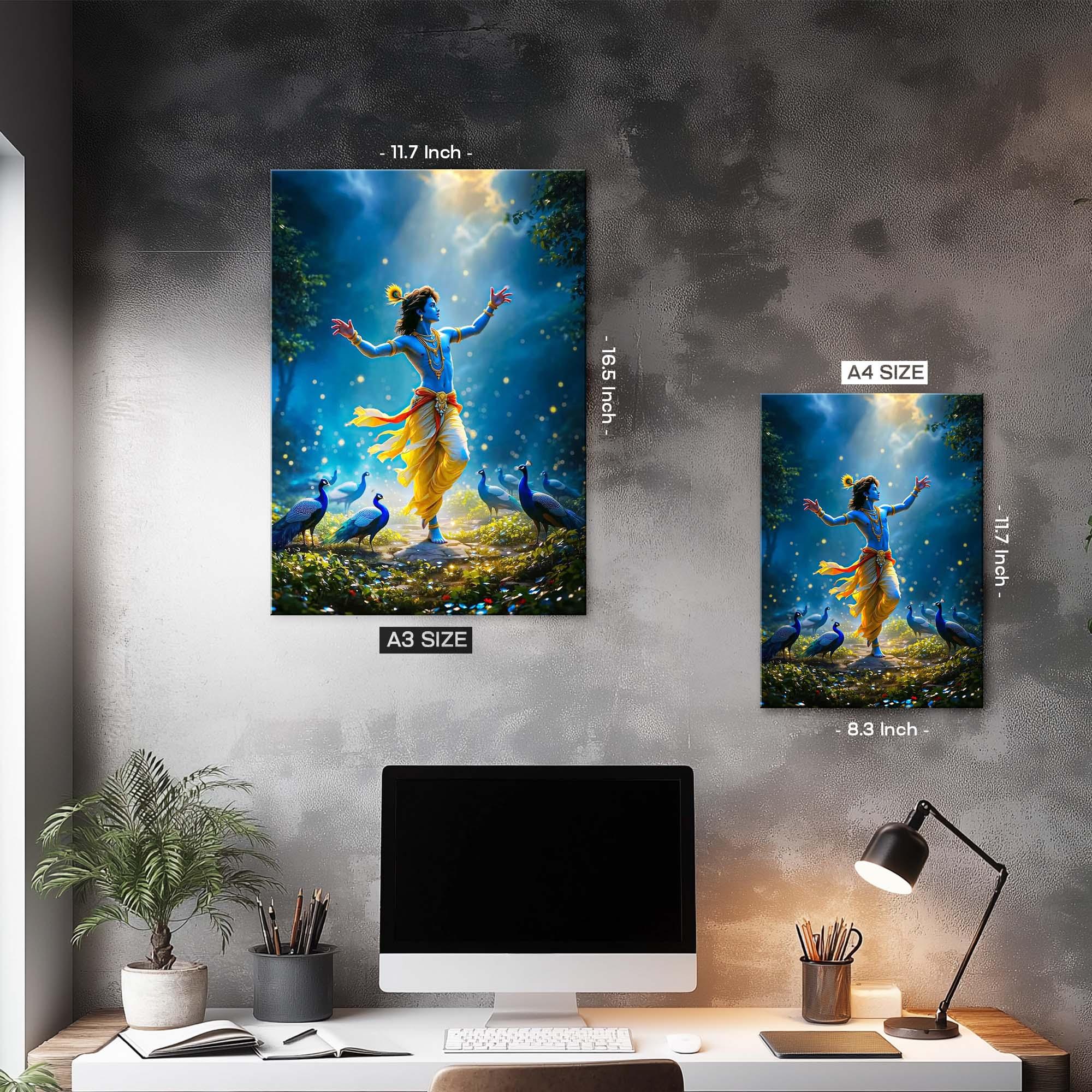 Bathed in a mystical blue glow, Shree Krishna dances gracefully beneath a shower of heavenly light, His arms outstretched as if embracing all existence. Draped in flowing golden-yellow garments, adorned with sacred ornaments and crowned with the iconic peacock feather, He becomes the living embodiment of bliss, freedom, and divine love. Each step He takes awakens the earth, and each gesture sends waves of joy through the cosmos.