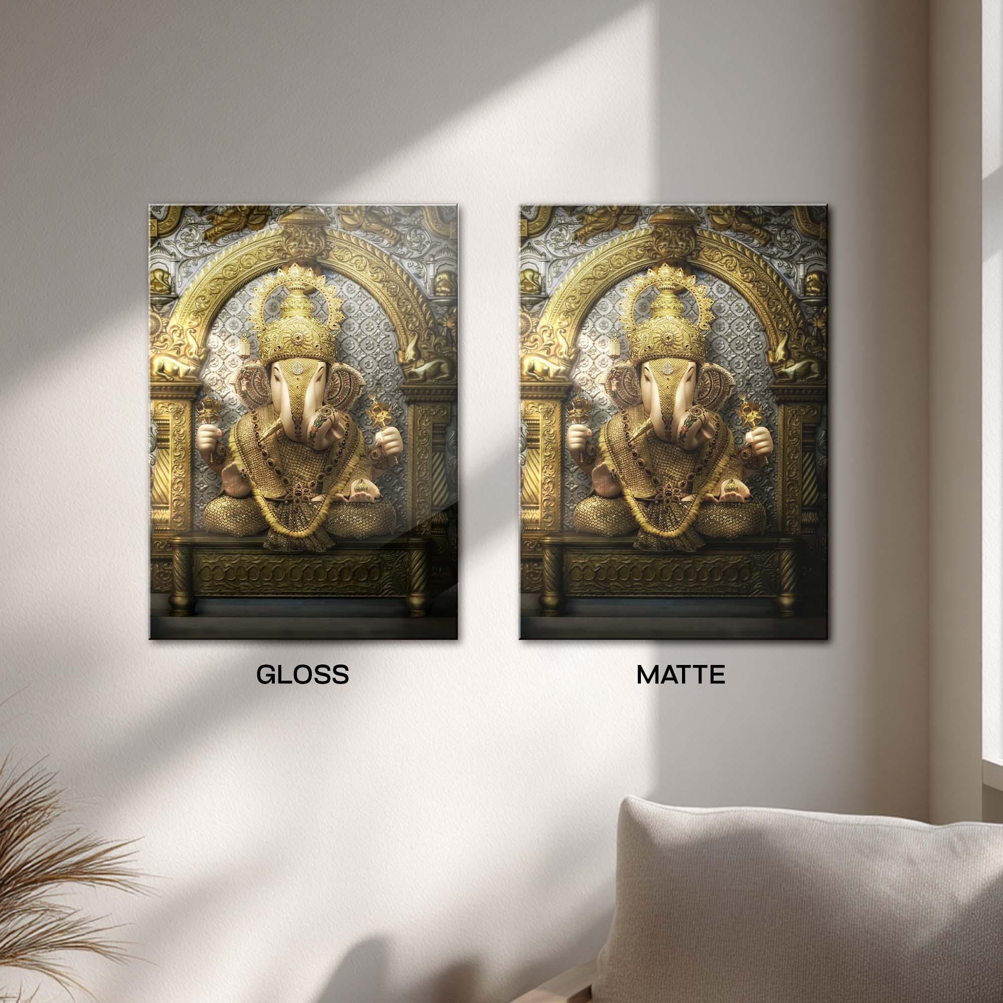 Adorned with divine ornaments and holding symbols of wisdom, blessings, and success, Lord Ganesha appears as the eternal guardian who removes obstacles and blesses new beginnings. The rich gold tones, temple-style arch, and sacred detailing create an atmosphere of peace, devotion, and divine presence.