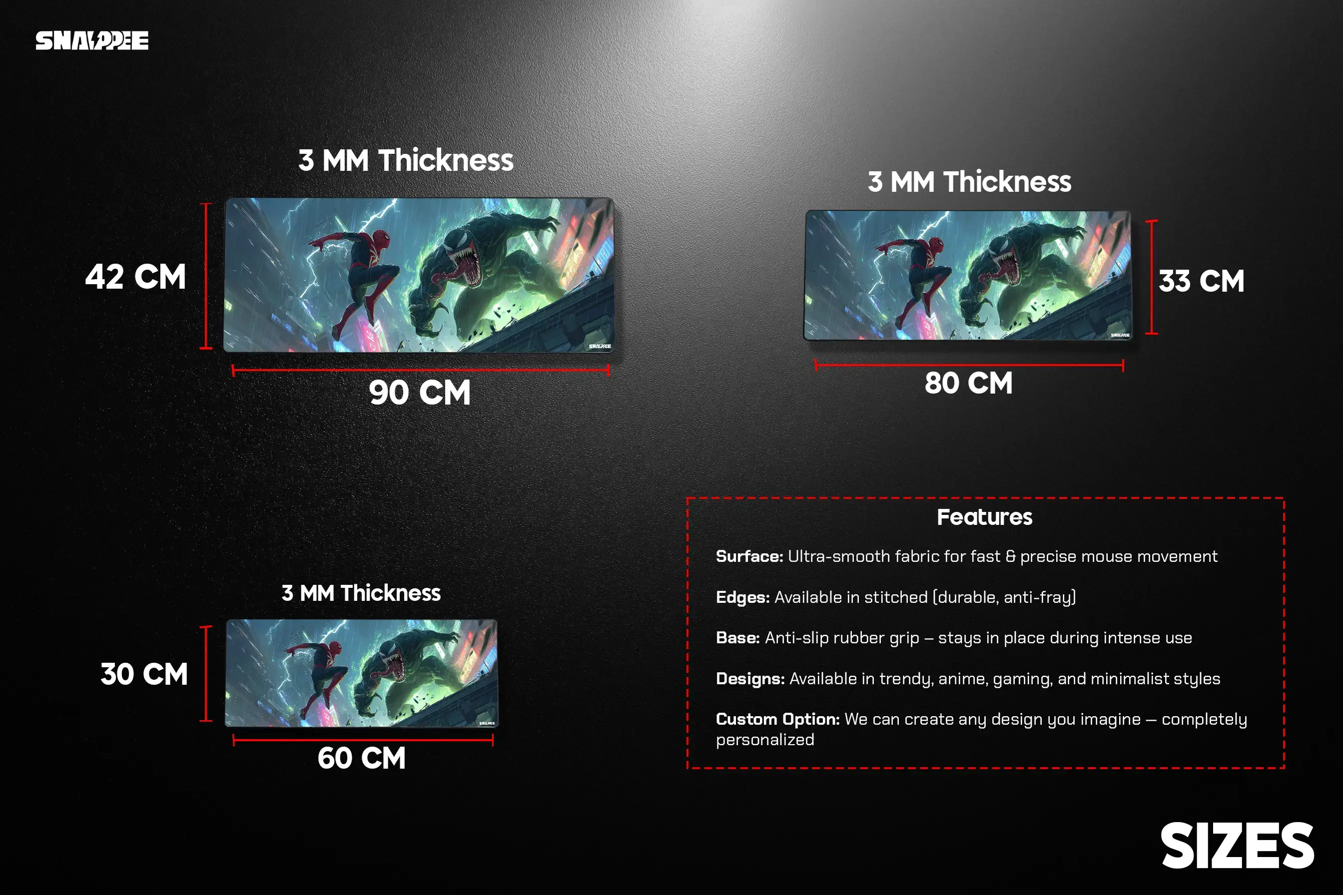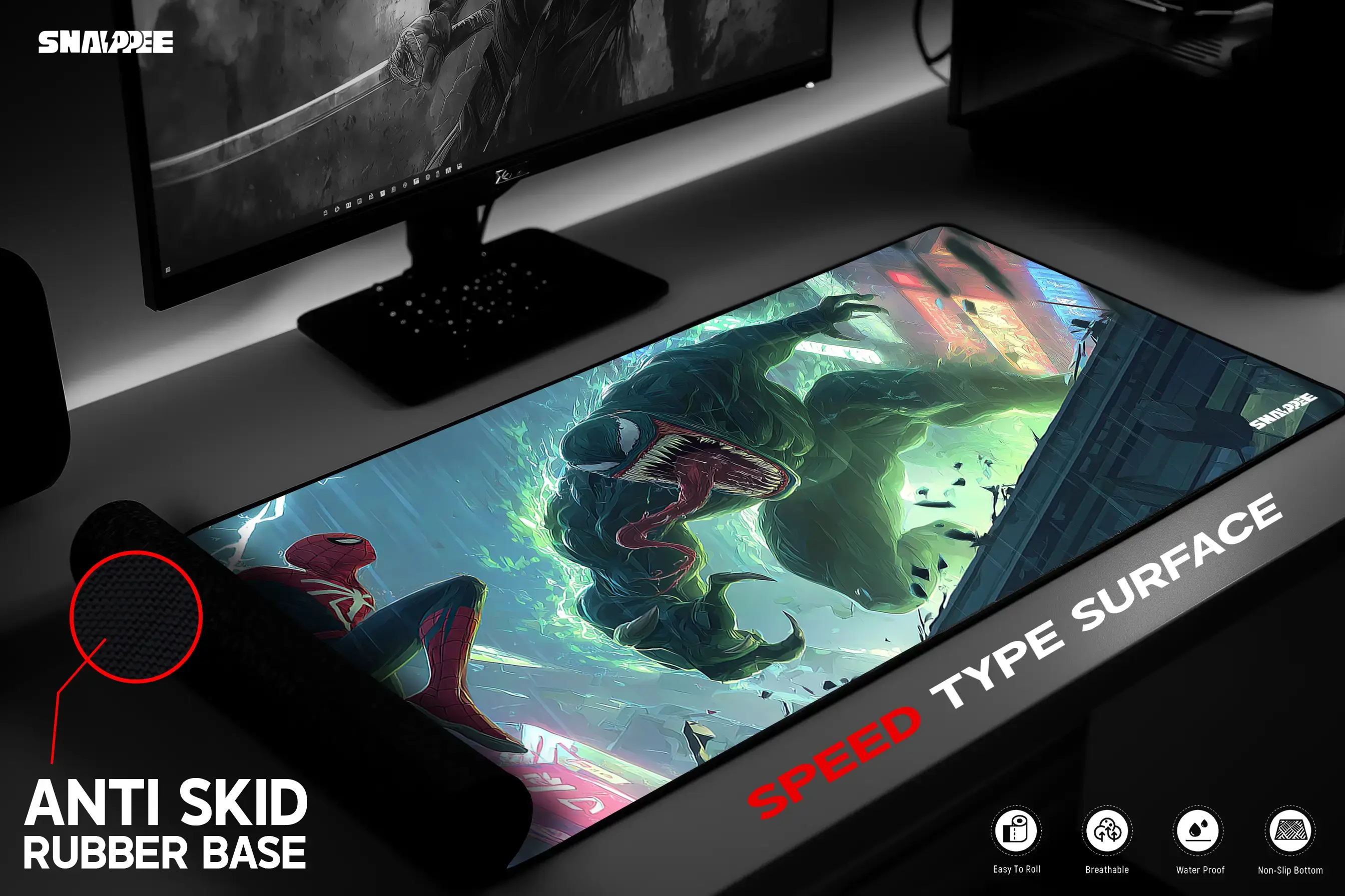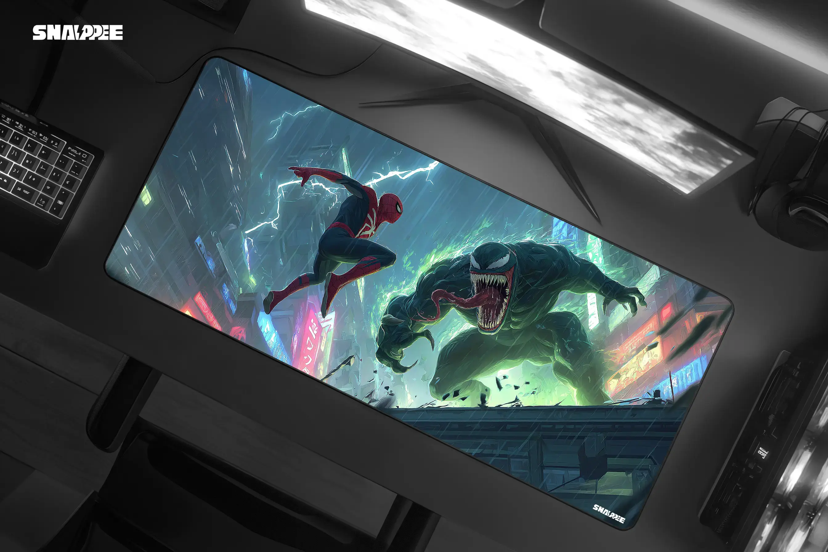 Witness the clash of legends on your desk with the OMG Customs Spider-Man vs Venom Gaming Mousepad. Featuring an electrifying battle scene of Spider-Man squaring off against Venom in a neon-lit city, this mousepad is a must-have for Marvel fans and gamers alike. Engineered for precision, durability, and style, it transforms your setup into an arena of heroes and symbiotes.