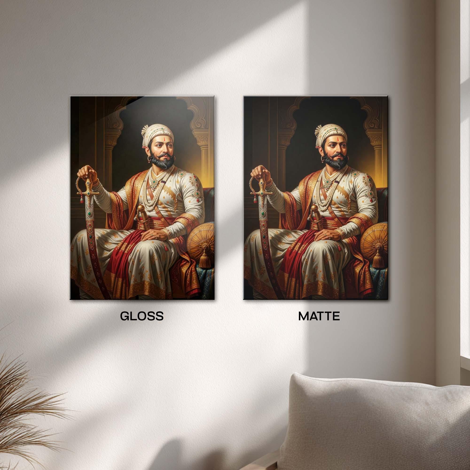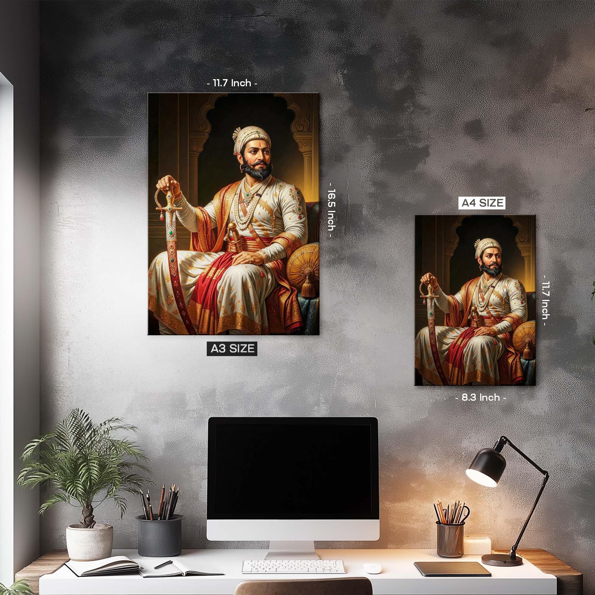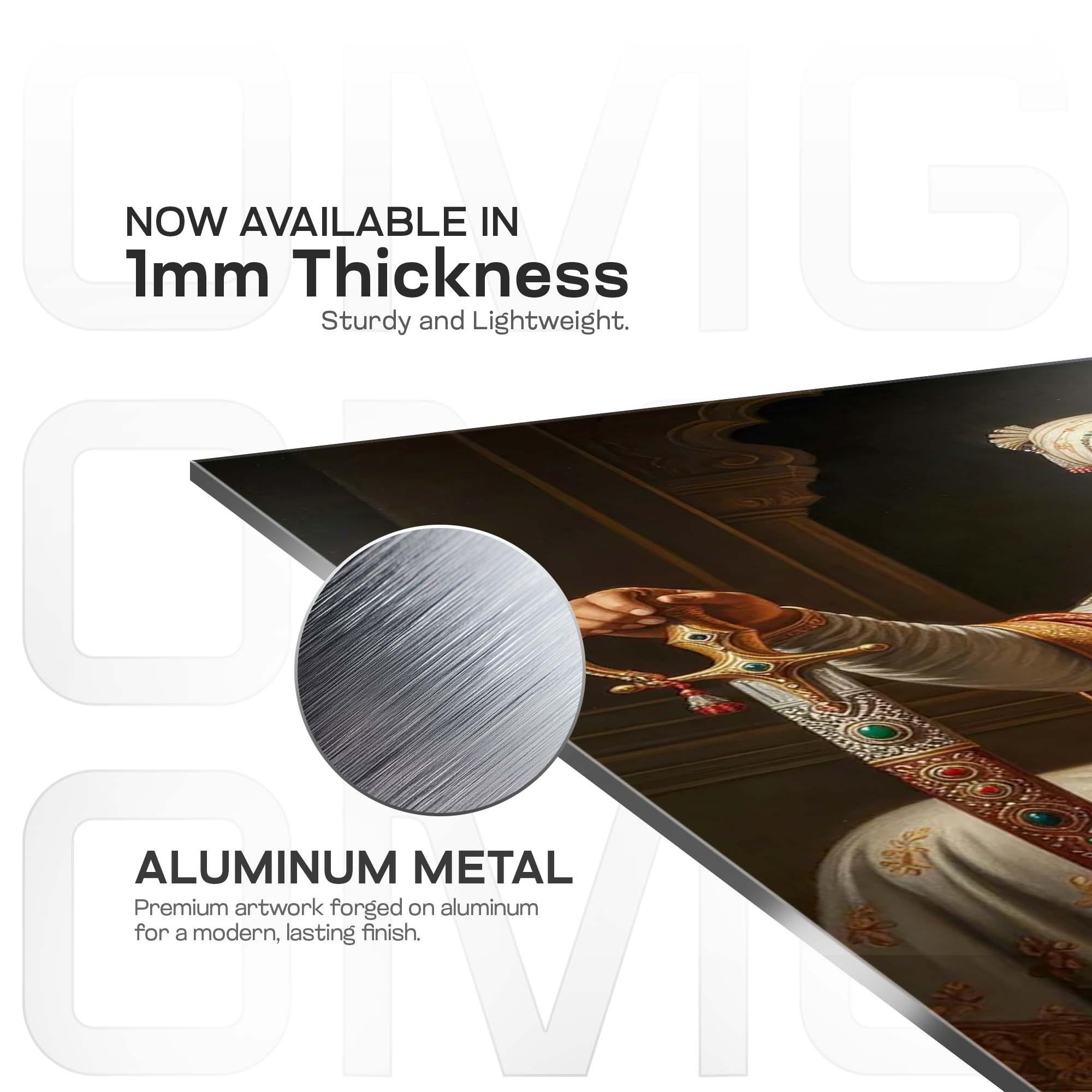 The warm glow behind him evokes the sanctity of a royal court guided by moral clarity. His turban, ornaments, and sacred markings signify devotion, discipline, and divine responsibility. This is not a conqueror intoxicated by power—this is a protector of land, faith, and freedom.