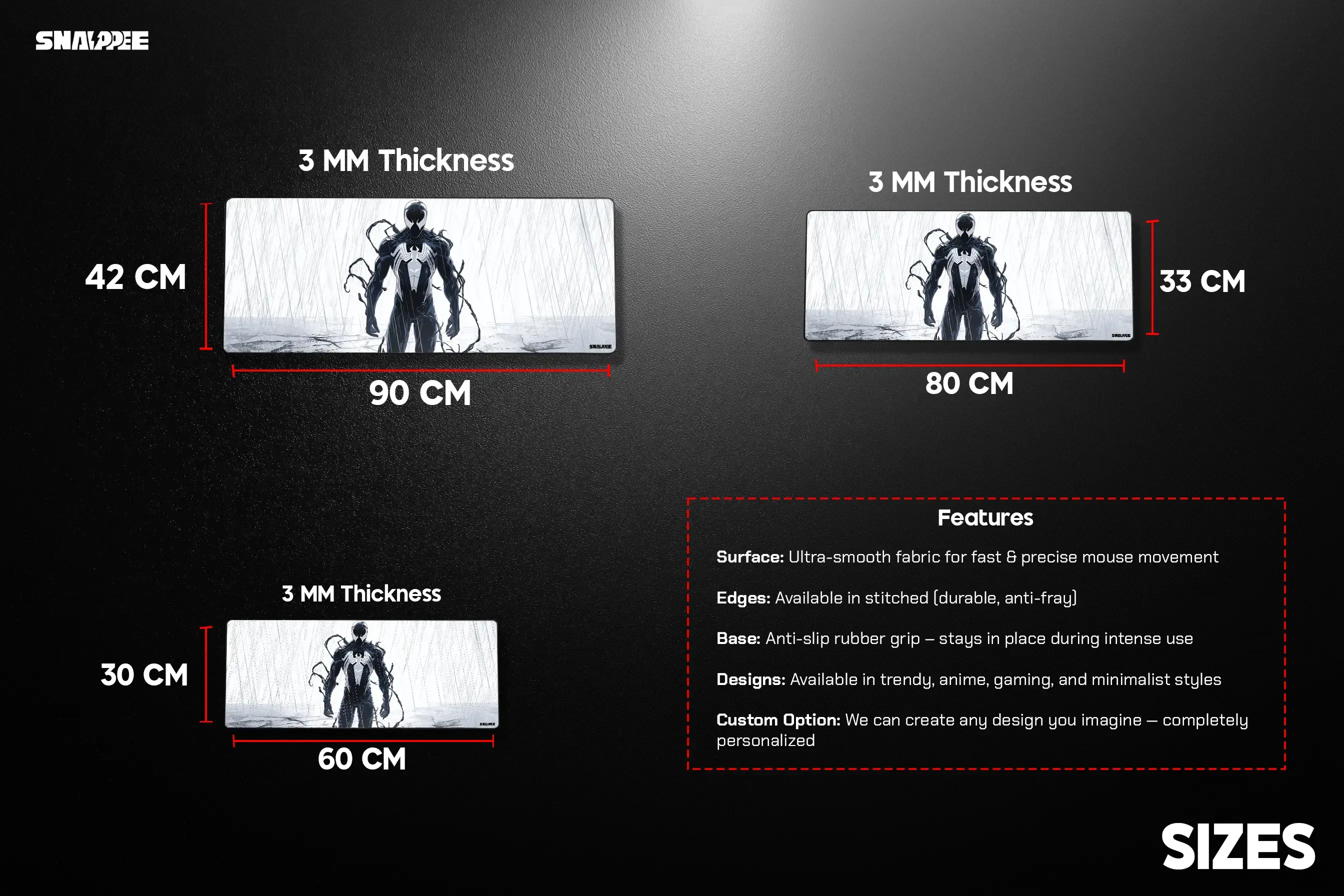 Step into the shadows with the OMG Customs Venom’s Reign Gaming Mousepad! Showcasing a powerful artwork of Venom standing tall in the pouring rain, this design embodies raw dominance, fearlessness, and the untamed power of the symbiote. A perfect choice for fans of anti-heroes and gamers who thrive on intensity, this mousepad blends bold style with pro-grade performance to elevate every battle and creation.